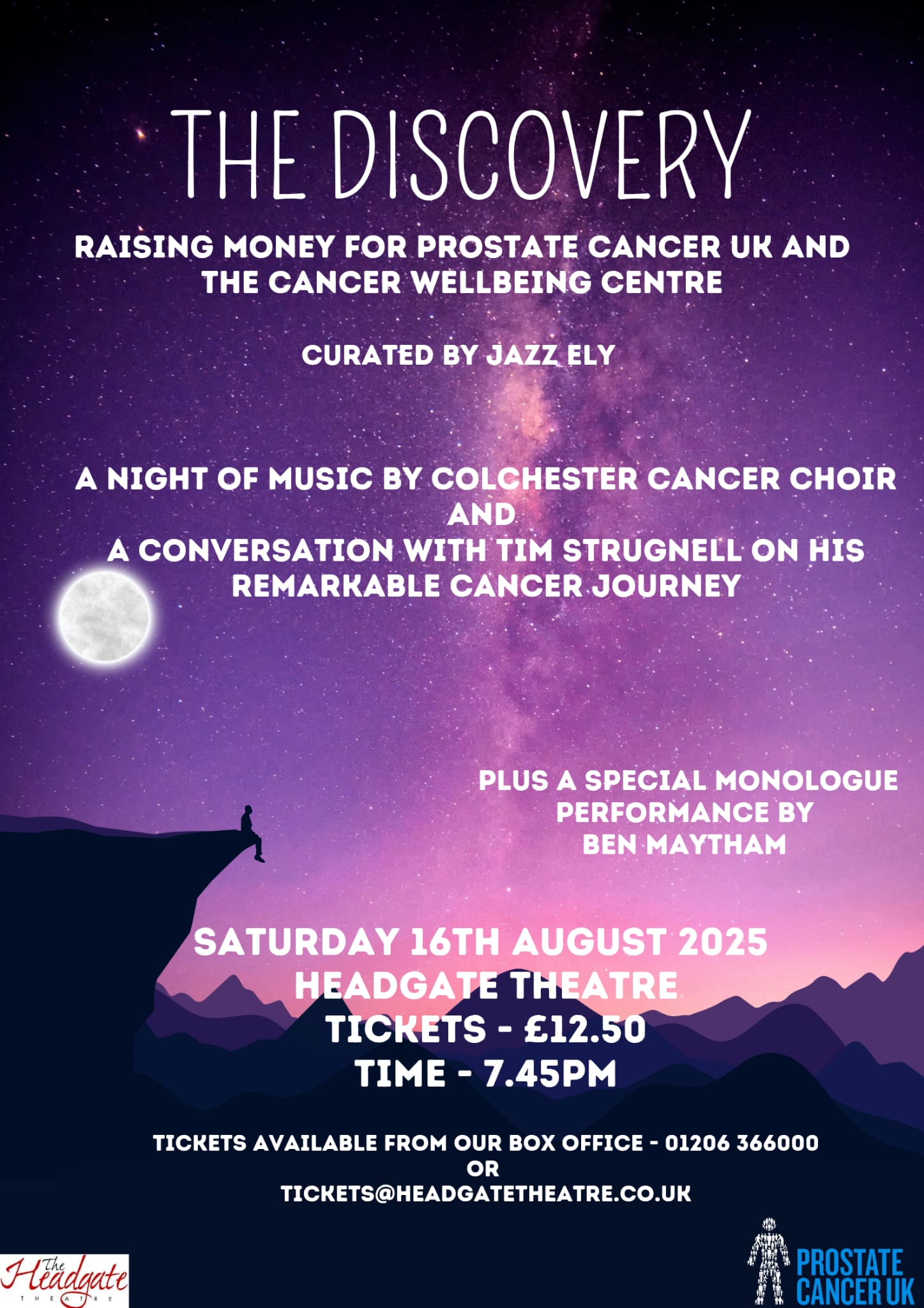 An uplifting evening of music and conversation, raising funds for Prostate Cancer UK and the Cancer Wellbeing Centre. Featuring performances by Colchester Cancer Choir, a special monologue by Ben Maytham, and Tim Strugnell sharing his remarkable cancer journey.